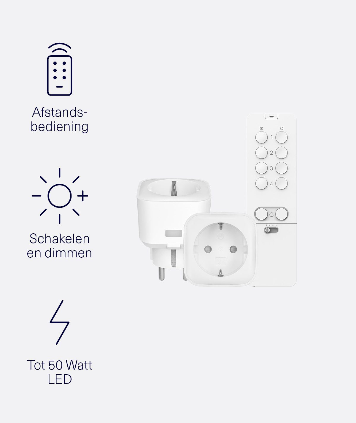 Met deze stopcontactdimmers kun je ledverlichting tot 100 Watt en gloeilampen en halogeenverlichting tot 250 Watt draadloos dimmen. Je kunt kiezen tussen twee verschillende dimmodi – fase aan- en afsnijding – zodat je de modus kunt selecteren die het meest geschikt is voor je dimbare lampen. Zo voorkom je dat deze gaan knipperen of flikkeren. Dimbare lampen van goede kwaliteit zijn aanbevolen om optimale dimprestaties te garanderen. Zo kun je genieten van precies het juiste licht in huis.